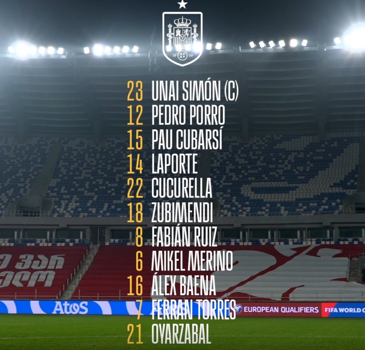西班牙首发:23-乌奈·西蒙、12-波罗、15-库巴西、14-拉波尔特、22-库库雷利亚、18-苏维门迪、8-法比安、6-梅里诺、16-巴埃纳、7-费兰、21-奥亚萨瓦尔
