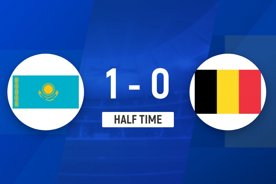 上半场比赛结束,哈萨克斯坦1-0比利时。