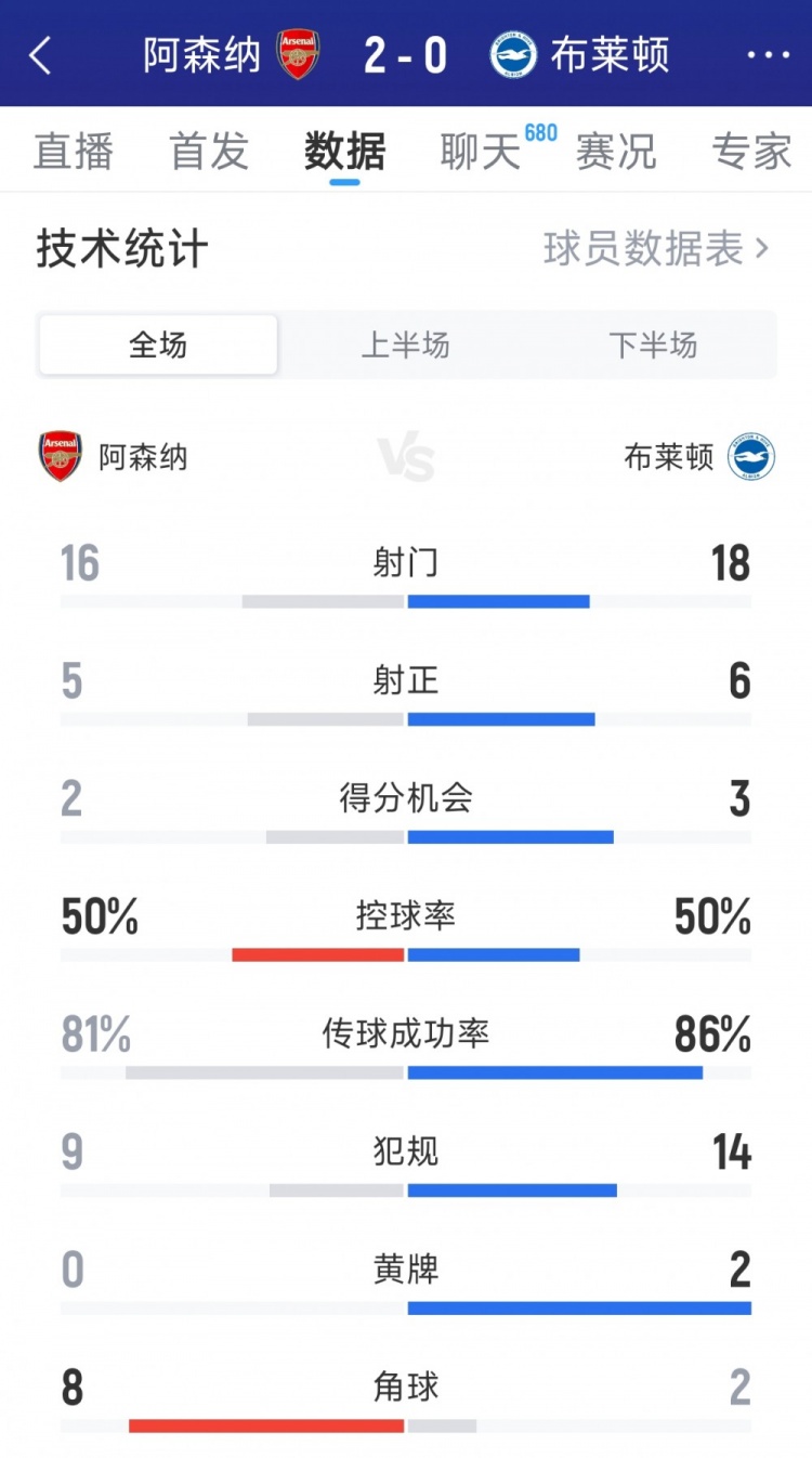 2025-10-30 08:03:39阿森纳2-0布莱顿全场数据:射门16-18,射正5-6,得分机会2-3